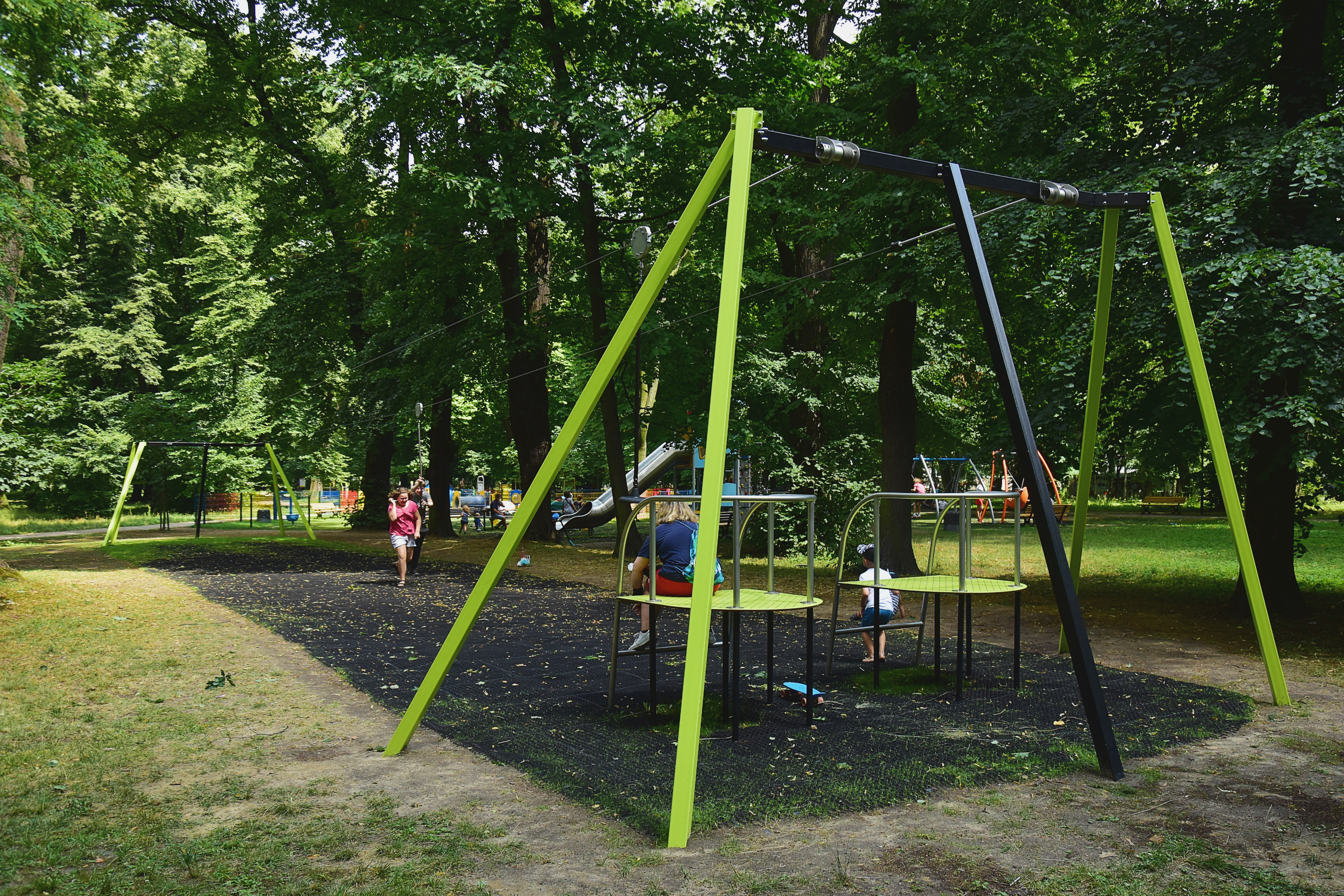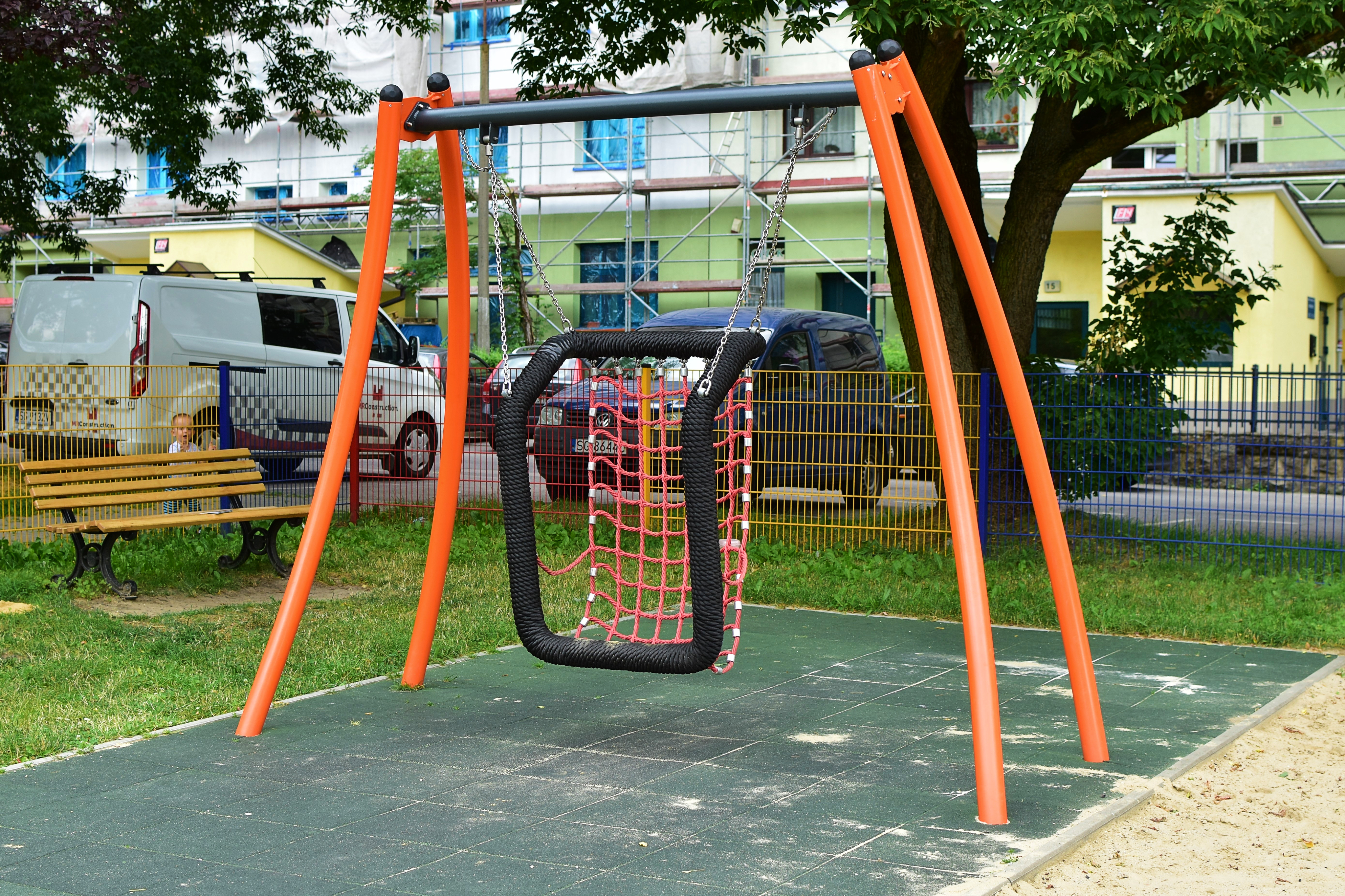 Huśtawka dla osób niepełnosprawnych w dzielnicy Kopernika na placu zabaw przy ulicy Centaura. Nawierzchnię wyłożono bezpiecznymi, gumowymi płytami, przygotowano również dojście do urządzenia z kostki betonowej.